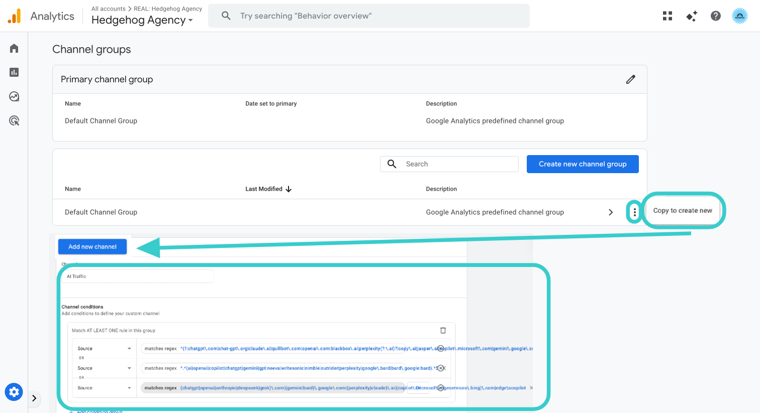 - You can create a custom channel group using regular expressions (regex) to group known AI referral sources.