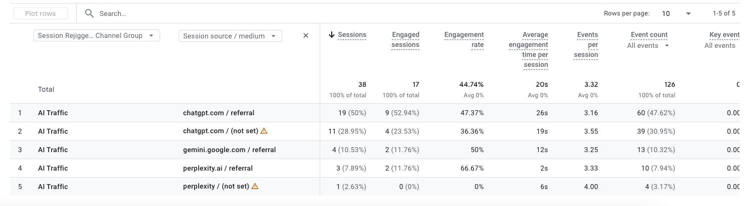 - You won’t see “chat.openai.com” or “perplexity.ai” consistently as a source in GA4.