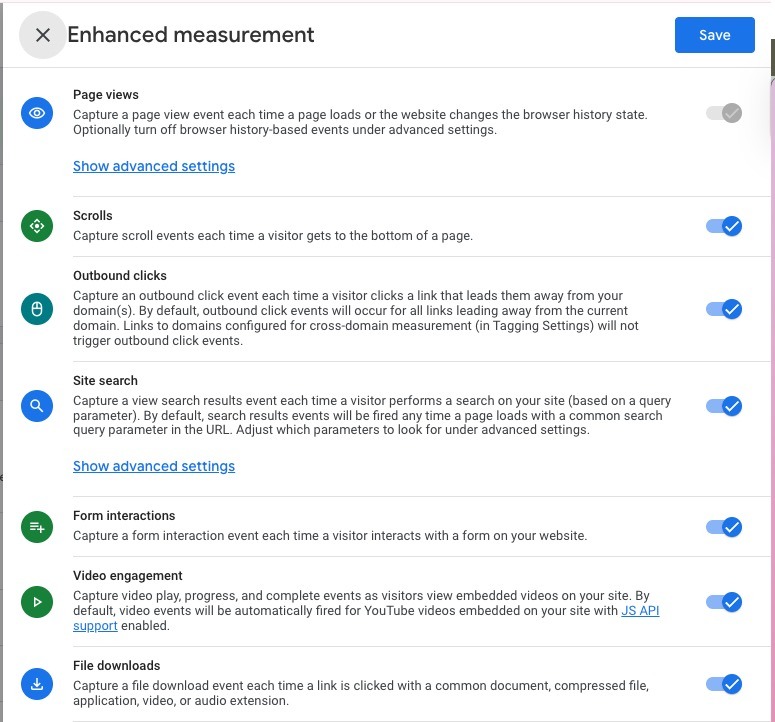 - Enhanced measurement events → Easy to enable with a toggle (e.g., scrolls, outbound clicks, site search).