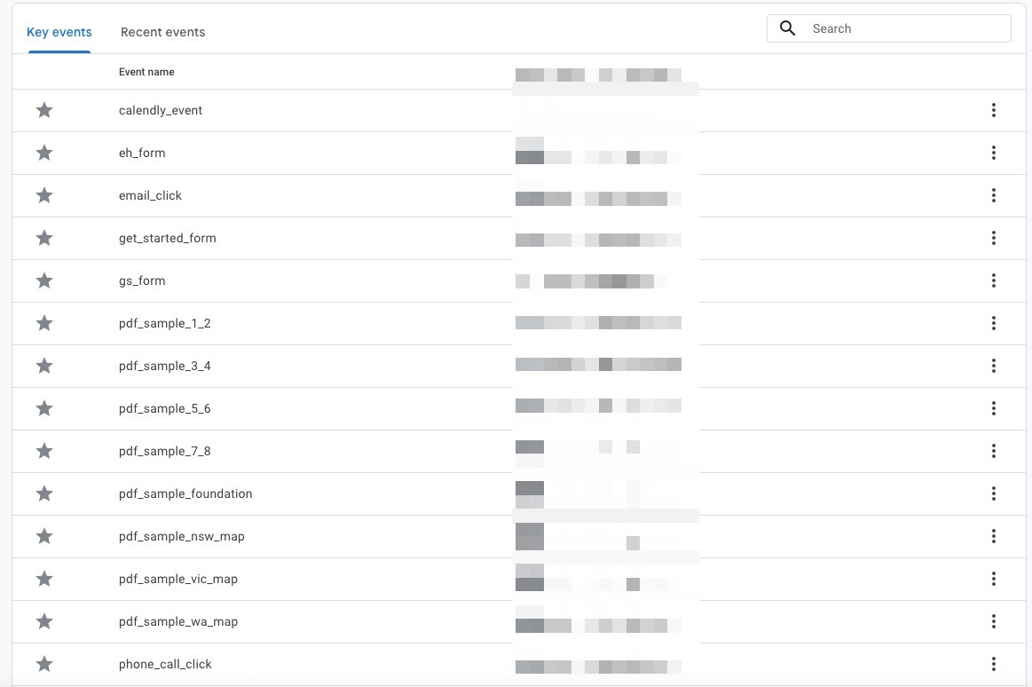 - Events are grouped into automatic, enhanced measurement, and custom categories.